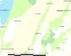 Les communes les plus proches[Note 1] sont[3] : Barthe (1,2 km), Hachan (1,3 km), Organ (2,0 km), Vieuzos (2,0 km), Campuzan (2,5 km), Cizos (3,0 km), Puntous (3,3 km), Caubous (3,6 km).