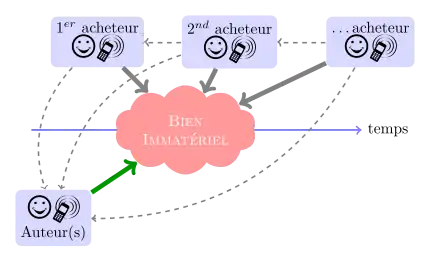 Une transaction commerciale d'un bien immatériel obéit à d'autres lois. Premièrement le vendeur n'est pas dépossédé de son bien lors de la vente et il traite non pas avec un seul mais avec plusieurs acheteurs, qui ne se présentent pas forcément au même moment. La transaction n'est plus instantanée, mais peut être infinie dans le temps. La notion de bien matériel induit une relation de type un-un tandis qu'un bien immatériel induit une relation de type plusieurs-plusieurs. Ce bien est dit non rival car la possession par un acheteur ne contraint pas la possession éventuelle d'un autre acheteur.