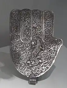 Dans les régions méridionales du Maroc, en particulier dans les régions du Drâa-Tafilalet et du Souss avec l'important marché de Tiznit, les Juifs berbères, qui y vivent au moins dès le IIe siècle av. J.-C. jusqu'à leur émigration à la fin des années 1950[36],[37], sont des orfèvres réputés pour leurs bijoux berbères. Puisque la khamsa[38] a également une réputation protectrice contre le mauvais sort pour les juifs, de telles pièces sont également réalisées avec une étoile de David[39],[40].