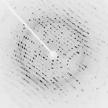 Une fois des cristaux de taille suffisante obtenus (quelques dizaines à quelques centaines de microns), on les place dans un faisceau de rayons X monochromatiques, produit par une source adaptée, un générateur de laboratoire ou un synchrotron, ces derniers produisant des faisceaux nettement plus intenses. Dans ces conditions, les électrons des molécules ordonnées dans le cristal diffractent les rayons X. Avec un détecteur, on enregistre des images du motif de diffraction obtenu qui est constitué de taches régulièrement espacées, pour différentes orientations du cristal. L'espacement des tâches renseigne sur la maille du cristal, c'est-à-dire les dimensions de l'élément de volume qui est régulièrement répété dans l'espace, pour donner naissance au cristal. Les intensités des tâches contiennent quant à elles une partie de l'information sur la densité électronique de chacune des macromolécules présentes dans la maille. La phase du signal associé à chaque tache est cependant perdue et il faut alors la reconstituer. Différentes méthodes permettent de reconstruire les phases :