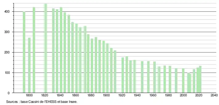 L'évolution du nombre d'habitants est connue à travers les recensements de la population effectués dans la commune depuis 1793. Pour les communes de moins de 10 000 habitants, une enquête de recensement portant sur toute la population est réalisée tous les cinq ans, les populations légales des années intermédiaires étant quant à elles estimées par interpolation ou extrapolation[14]. Pour la commune, le premier recensement exhaustif entrant dans le cadre du nouveau dispositif a été réalisé en 2008[15].