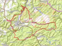 L'occupation des sols de la commune, telle qu'elle ressort de la base de données européenne d’occupation biophysique des sols Corine Land Cover (CLC), est marquée par l'importance des forêts et milieux semi-naturels (78,3 % en 2018), une proportion sensiblement équivalente à celle de 1990 (79,1 %). La répartition détaillée en 2018 est la suivante : forêts (76,2 %), prairies (7,4 %), zones urbanisées (6,7 %), zones industrielles ou commerciales et réseaux de communication (5,3 %), milieux à végétation arbustive et/ou herbacée (2,1 %), espaces verts artificialisés, non agricoles (1,7 %), terres arables (0,5 %)[23]. L'évolution de l’occupation des sols de la commune et de ses infrastructures peut être observée sur les différentes représentations cartographiques du territoire : la carte de Cassini (XVIIIe siècle), la carte d'état-major (1820-1866) et les cartes ou photos aériennes de l'IGN pour la période actuelle (1950 à aujourd'hui)[Carte 3].