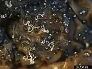 ![]() Pycnide ![]() Pycnides expulsant des tortillons visqueux de pycnidiospores (Forestry images, Bruce Watt, Uni. of Maine) |