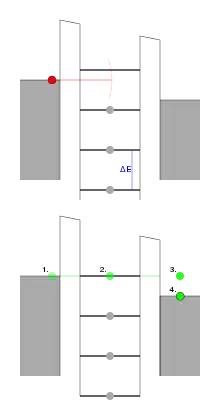 Lorsqu'une tension positive est appliquée à l'électrode de porte, les niveaux d'énergie de l'électrode d'îlot sont abaissés. Ainsi maintenant, un électron de l'électrode de source (voir figure en vert 1.) peut pénétrer dans l'îlot (2.), occupant un niveau d'énergie précédemment vacant car anciennement trop élevé. À partir de là, il peut pénétrer dans l'électrode de drain (3.) où il se diffuse de façon inélastique et atteint le niveau de Fermi de l'électrode de drain (4.).
