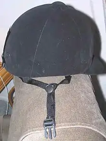 Casque d'équitation moderne, avec mentonnière, visière, aération, et trois points d'attache
