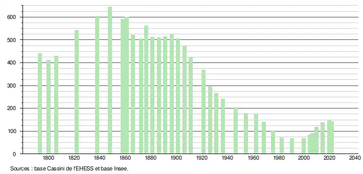 L'évolution du nombre d'habitants est connue à travers les recensements de la population effectués dans la commune depuis 1793. Pour les communes de moins de 10 000 habitants, une enquête de recensement portant sur toute la population est réalisée tous les cinq ans, les populations légales des années intermédiaires étant quant à elles estimées par interpolation ou extrapolation[14]. Pour la commune, le premier recensement exhaustif entrant dans le cadre du nouveau dispositif a été réalisé en 2004[15].