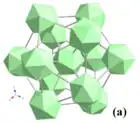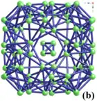 (a) Unité de 13 icosaèdres B12 ((B12)13 ou supericosaèdre), et (b) unité cluster de B80 de la structure de YB66. Le nombre excessif de liaisons (dans l'image 9B) résulte de l'hypothèse que tous les sites sont occupés, alors que le nombre total d'atome de bore est de seulement 42[11]. | ||