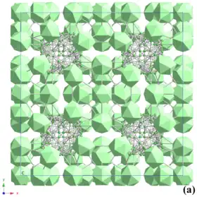 L'autre unité de base de la structure de YB66 est un cluster B80 de 80 sites de bore formés par les sites B10 à B13[11]. Ces 80 sites sont partiellement remplis, et ne comptent au total que 42 atomes de bore. Le cluster B80 occupe le centre du site octaédrique , c'est-à-dire aux 8 positions équivalentes (1/4 ; 1/4 ; 1/4) ; il y a ainsi huit clusters (soit 336 atomes de bore) par maille. Deux études indépendantes sur l'analyse de la structure de YB66 sont arrivées au même résultat[11],[12], qui donne un total de 1584 atomes de bore par maille. Cette structure est présentée dans les figures à droite. Il existe 48 sites d'yttrium ((0,0563 ; 1/4 ; 1/4) pour YB62[11]) dans cette maille. en ayant une occupation de 50 %, on obtient 24 atomes d'yttrium par maille, soit la composition chimique de YB66 (1584/24=66). Cette occupation de 50 % implique que chaque paire d'yttrium est constituée d'un site occupé et d'un site vide[12].