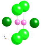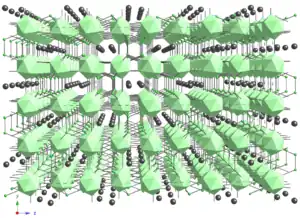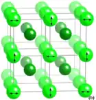 À gauche : schéma du réseau de YB66. Les boules vert clair représentent les supericosaèdres ((B12)13) et leur orientations relatives sont indiquées par des flèches. Les boules vert foncé correspondent aux clusters B80. À droite : paire de sites Y (boules roses) de YB66 ; il y a ainsi deux sites entre chaque paire de sites B80 (boule vert foncé), soit 48 sites par maille. Statistiquement, seul un de ces sites est occupé, soit 24 atomes d'yttrium par maille, pour 1584 atomes de bore[11]. | ||