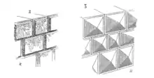 - Le bossage à onglets : les joints du parement sont figurés par des canaux larges et profonds[2].