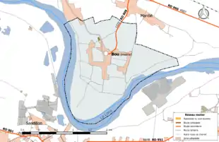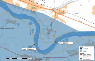 La totalité de la commune de Bou se trouve en zone inondable, dans le val de Bou, comprenant 94 ha en espaces agricoles, 69 ha en eau, 126 en espaces naturels, 4 en serres et 108 en surfaces urbanisées[12]. 928 personnes résident dons cette zone[13]. D’une superficie de 650 ha, le val de Bou occupe l’intérieur du grand méandre de Sandillon, en rive droite de la Loire. Il ne comporte pas de cours d’eau. Le Cens canalisé (canal d’Orléans) limite ce val au nord-ouest, en bordure de Chécy[14]. Ce val est protégé en totalité par une levée continue, sans déversoir, d’une longueur de 6,75 km. Un important risque de brèches existe pour cette levée dont toute la moitié amont, entre Latingy et le hameau de la Binette, se trouve face au courant, en rive concave de la Loire. Lors des crues du XIXe siècle, plusieurs brèches se sont produites : brèche amont par où les eaux ont envahi le val et brèches aval lors de sa vidange[14].