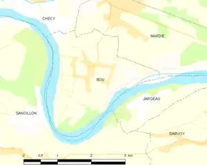 | Grèves d'Albœuf et de la Haute Ile | type 1[Note 2] | 76 hectares | La zone s'étend sur 3 communes (Bou, Chécy et Sandillon) et se situe à la sortie du méandre de Sandillon, entre les communes de Bou et de Sandillon[37]. Son altitude est de 97 m[INPN 5]. La zone comprend plusieurs grèves d'étendue et de forme variables selon le niveau de la Loire et selon les années. Au cours des dernières années, ces grèves ont accueilli l'une des plus importantes colonies de sternes du département[INPN 6]. | ![]() Carte des ZNIEFF de la commune et de ses abords. |