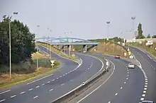 Échangeur entre RN13 et RN814 : Cherbourg, Carpiquet (bourg et aéroport de Caen-Carpiquet) et Bayeux- Pont qui enjambe la ligne de Mantes-la-Jolie à Cherbourg