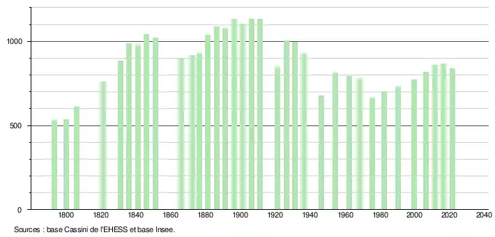 L'évolution du nombre d'habitants est connue à travers les recensements de la population effectués dans la commune depuis 1793. Pour les communes de moins de 10 000 habitants, une enquête de recensement portant sur toute la population est réalisée tous les cinq ans, les populations légales des années intermédiaires étant quant à elles estimées par interpolation ou extrapolation[21]. Pour la commune, le premier recensement exhaustif entrant dans le cadre du nouveau dispositif a été réalisé en 2006[22].