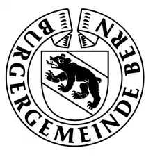 La commune bourgeoise de Berne (Burgergemeinde Bern) naît sous sa forme moderne en [46] et est dotée d'un Petit et Grand Conseils (exécutif et législatif respectivement)[47],[48]. En ville de Berne sont aussi présentes des sociétés bourgeoises (Gesellschaften et Zünfte, issus de corps de métiers) et des abbayes, regroupées sous le terme de corporations bourgeoises, et sont affiliées la commune bourgeoise de Berne[49]. La commune bourgeoise de Berne administre plus de 4 000 ha de forêts, le Burgerspital, une bibliothèque, le Musée d'histoire naturelle de Berne, le Casino de Berne, de même qu'une banque (DC Bank)[50].