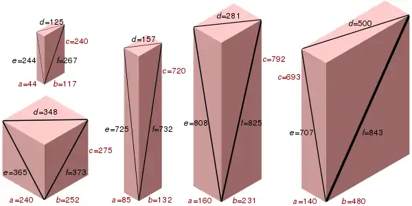 où a, b, c sont les longueurs des arêtes de la brique et d, e, f les longueurs des diagonales des faces.