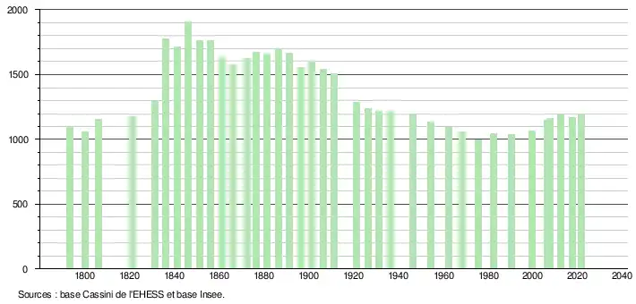 L'évolution du nombre d'habitants est connue à travers les recensements de la population effectués dans la commune depuis 1793. Pour les communes de moins de 10 000 habitants, une enquête de recensement portant sur toute la population est réalisée tous les cinq ans, les populations légales des années intermédiaires étant quant à elles estimées par interpolation ou extrapolation[26]. Pour la commune, le premier recensement exhaustif entrant dans le cadre du nouveau dispositif a été réalisé en 2007[27].