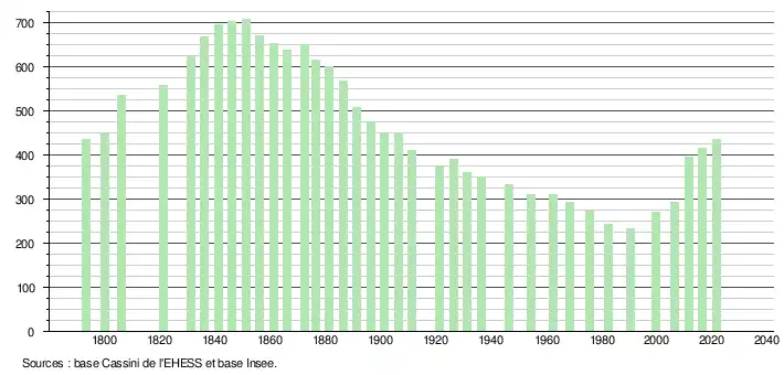 | L'évolution du nombre d'habitants est connue à travers les recensements de la population effectués dans la commune depuis 1793. Pour les communes de moins de 10 000 habitants, une enquête de recensement portant sur toute la population est réalisée tous les cinq ans, les populations légales des années intermédiaires étant quant à elles estimées par interpolation ou extrapolation[27]. Pour la commune, le premier recensement exhaustif entrant dans le cadre du nouveau dispositif a été réalisé en 2006[28]. En 2021, la commune comptait 435 habitants[Note 7], en augmentation de 4,82 % par rapport à 2015 (Tarn : +1,82 %, France hors Mayotte : +1,84 %). |