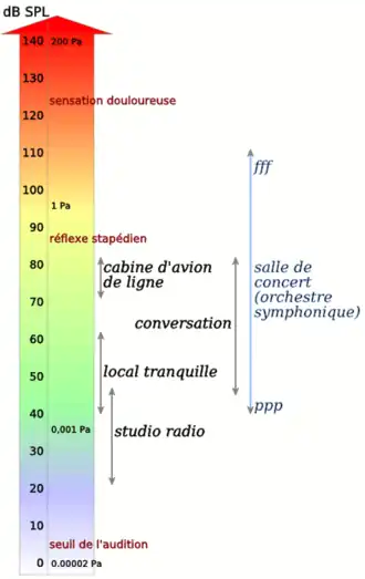 Échelle des niveaux sonores, voir décibel, avec seuil d'apparition du « réflexe stapédien » et de la douleur.