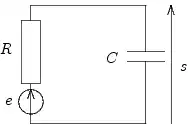 Pour ce faire, on considère une résistance R mise en série avec une capacité C. Sur le schéma ci-contre, la résistance est représentée par une résistance parfaite mise en série avec un générateur de bruit. La résistance R et la capacité C sont en équilibre thermique, c'est-à-dire qu'ils échangent entre eux de l'énergie de telle sorte que l'énergie accumulée dans la capacité soit soumise à des fluctuations soit la tension aux bornes de la capacité: