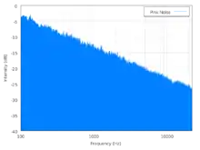 - D’autre part, sur les diagrammes de spectres sonores, on voit que la densité de puissance sonore du bruit rose, comparée à celle du bruit blanc, diminue de 3 dB par octave : la densité de puissance sonore est proportionnelle à 1/F (où F est la fréquence). C’est pour cela que le bruit rose est souvent appelé « bruit 1/F ».