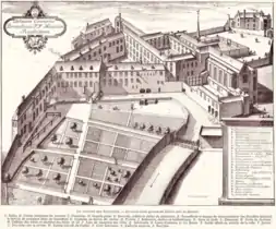 Contrairement à la gravure représentée ci-contre et qui fut réalisée au début du XVIIIe siècle par le graveur Jacques Harrewyn, le couvent médiéval, au sujet duquel nous savons bien peu de choses, était nettement moins étendu et se développait, selon toutes vraisemblances, exclusivement sur la rive droite de la Senne ; un premier jardin « ultra fluvium Sennam » n'étant en effet obtenu que dans les années 1620[10]. Dans les années 1663-1666, un nouveau chauffoir (« hypocaustum » en latin) fut construit derrière le cloître tandis que le couvent ne se dota d'une brasserie qu'en 1707[11].