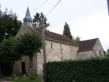 - Située au centre du village, sur une sorte de promontoire, et bien orientée, l'église, précédée d'un porche en bois surélevé de quelques marches, affecte la forme générale d'un rectangle de 31,50 m sur 16 m, terminé à l'est par un chevet demi-circulaire de trois mètres de rayon. Un pignon couronne la façade occidentale percée de trois portes et clocher carré, couvert d'une flèche d'ardoise, s'élève au-dessus du collatéral nord.