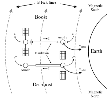 On considère un engin spatial en orbite autour d'un objet céleste doté d'un champ magnétique (typiquement celui de la Terre, mais cela s'applique pour tout autre objet céleste présentant cette caractéristique). L'engin spatial est doté d'un câble conducteur, stabilisé par gradient de gravité. Le mouvement du câble conducteur électrique au travers du champ magnétique de l'objet céleste génère une force électromotrice, laquelle peut être calculée de la manière suivante :