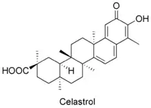 Dans des expériences animales in vitro et in vivo, le célastrol présente des propriétés antibactériennes[3], antioxydantes[4], anti-inflammatoires[5],[6], anticancéreuses[7],[8],[9],[10],[11],[12], et est insecticide[13]. Il a été démontré qu'il a des effets sur le contrôle de l'obésité chez la souris en inhibant les régulateurs négatifs de la leptine[14],[15],[16]. Le célastrol a également montré qu'il possédait (par inhibition de NF-κB dans l'hypothalamus[17]) des effets antidiabétiques sur la néphropathie diabétique et qu'il améliorait la résistance à l'insuline du corps entier[18].