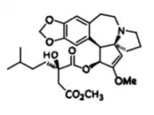- La synthèse de Weinstein en 9 étapes à partir du benzodioxole et dont le rendement est de 15%[9] . La cyclisation se fait par réaction de Friedel-Crafts. Le cycle pyrrole et le carbonyle sont ensuite réduits en amine qui est finalement oxydée en énamine.