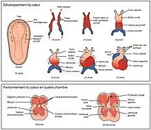Le cœur dérive du mésenchyme splanchnopleurique de la plaque neurale qui forme la région cardiogénique. Deux tubes endocardiques se forment ici et fusionnent pour former un tube cardiaque primitif connu sous le nom de cœur tubulaire[6]. Entre la troisième et la quatrième semaine, le tube cardiaque s'allonge et commence à se plier pour former une forme en S dans le péricarde. Cela place les chambres et les principaux vaisseaux dans le bon alignement pour le cœur développé. Le développement ultérieur comprendra la formation des septa et des valvules ainsi que le remodelage des cavités cardiaques. À la fin de la cinquième semaine, les septa sont terminés et à la neuvième semaine, les valvules cardiaques sont terminées[7].