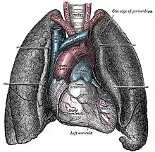 Dans le corps humain, le cœur se situe dans la région thoracique (poitrine), où il occupe plus précisément la portion antéro-inférieure du médiastin entre la seconde et le cinquième espace intercostale. Il est situé sur la ligne médiane, un peu décalé à gauche de telle sorte que deux tiers de sa masse sont situés du côté gauche. C'est la position normale dite de lévocardie, terme qui peut désigner aussi une malformation congénitale (situs solitus (en), situs inversus). Des malformations de naissance peuvent le placer à droite (dextrocardie) ou au milieu (mésocardie (pt))[2]. Le cœur est contenu dans la cavité péricardique qu'il occupe entièrement, et il est entouré par les poumons (recouverts de la plèvre) de chaque côté, le diaphragme en bas, le sternum en avant, l'œsophage en arrière et les troncs artériels (aorte et artère pulmonaire) en haut.