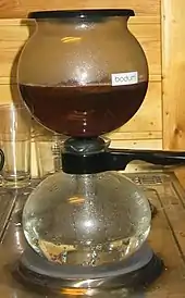 La partie inférieure (la boule) contient l'eau et la partie supérieure (la tulipe) reçoit la mouture. À l'aide d'un brûleur à alcool, l'eau chauffe et s'évapore, créant une surpression dans le globe inférieur. L'eau chaude (85 °C) monte à l'étage supérieur par le tube de la tulipe et inonde la mouture à travers le filtre textile. Après une ou deux minutes d'infusion, on arrête la source de chaleur, puis, la pression diminuant, le café infusé est aspiré par dépression dans le récipient inférieur, à travers le tube de la tulipe[6].