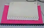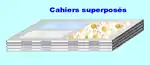 Après pliure les cahiers peuvent être encartés pour une piqure à cheval sur le pli avec du fil métallique agrafé (brochure, hebdomadaire).