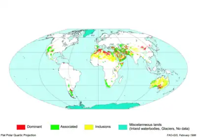 De nombreux calcisols sont accompagnés de solonchaks qui sont des calcisols affectés par le sel et/ou avec d'autres sols avec accumulation secondaire de calcaire qui ne sont pas incrustés comme les calcisols. La surface totale de zones calcisol pourrait bien s'élever à environ 10 millions de kilomètres carrés, presque tout entière situées dans les zones arides et semi-arides (sub)tropicales des deux hémisphères.