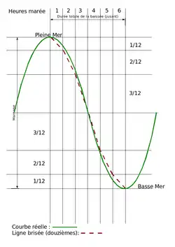 Ainsi, la variation relative du niveau des eaux est approximativement de 1/12 du marnage durant la première heure-marée, 2/12 durant la seconde, puis 3/12, 3/12, 2/12, 1/12.