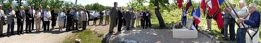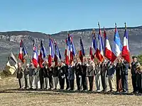 | Cérémonie annuelle du Clos d'Espargon (Camp de Canjuers). | La stèle avant son déplacement. | Le drapeau du SAP camp Lafayette. |