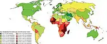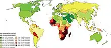 Certaines régions d'Asie occidentale et d'Afrique du Nord où l'incidence du cancer du col de l'utérus a une faible prévalence du HPV, ce qui s'explique le plus vraisemblablement par des facteurs sociétaux liés au comportement sexuel[48]. Ces pays présentent également de faibles taux d'autres infections sexuellement liées, telles que le VIH. En revanche, dans les régions d'Afrique subsaharienne, d'Amérique latine et d'Asie du Sud, les taux élevés de cancer du col utérin reflètent probablement un risque élevé, expliqué par les taux élevés de transmission du HPV et du VIH[49].