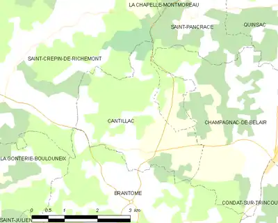 En 2018, année précédant son intégration à la commune nouvelle de Brantôme en Périgord, Cantillac était limitrophe de quatre autres communes.