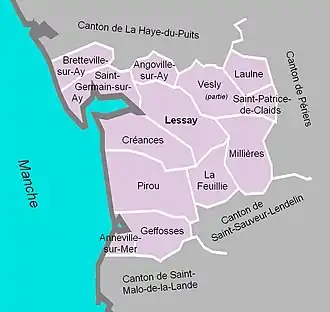 Le canton de Lessay n'incluait aucune commune supprimée depuis la création des communes sous la Révolution[10] hormis Saint-Germain-la-Campagne qui a rejoint le canton de Périers en fusionnant avec Gorges. Geffosses a absorbé Anneville entre 1795 et 1800, celle-ci reprenant son autonomie en 1830 sous le nom de Anneville-sur-Mer. Le , la commune de Gerville-la-Forêt s'associe à Vesly tout en conservant son appartenance au canton de La Haye-du-Puits.