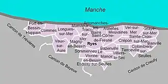 À la suite du redécoupage des cantons pour 2015, les communes de Commes, Esquay-sur-Seulles, Longues-sur-Mer, Magny-en-Bessin, Le Manoir, Manvieux, Port-en-Bessin-Huppain, Ryes, Sommervieu, Tracy-sur-Mer, Vaux-sur-Aure et Vienne-en-Bessin sont rattachées au canton de Bayeux, les communes de Colombiers-sur-Seulles, Tierceville et Villiers-le-Sec à celui de Bretteville-l'Orgueilleuse et les communes d'Arromanches-les-Bains, Asnelles, Banville, Bazenville, Crépon, Graye-sur-Mer, Meuvaines, Saint-Côme-de-Fresné, Sainte-Croix-sur-Mer et Ver-sur-Mer à celui de Courseulles-sur-Mer.