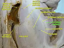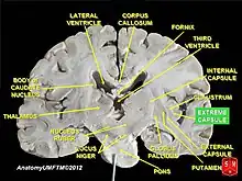Elle est plus facilement visible dans une coupe horizontale (transversale), juste latéralement au claustrum.