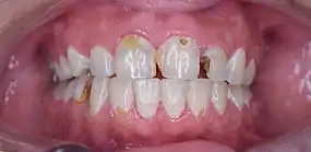 - le dépistage régulier chez le dentiste : cela permettra de traiter les caries assez tôt[40]. On ne guérit pas d'une carie dentaire, on stoppe sa progression par son curetage et on obture la cavité résiduelle. Le dépistage se fera idéalement tous les six mois, une visite annuelle au moins chez l'adulte qui présente peu de problèmes de carie dentaire ou de problèmes gingivaux (importance du détartrage)[43].