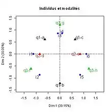 Ainsi, à chaque plan factoriel, on peut associer une représentation des variables qualitatives elles-mêmes[1].
