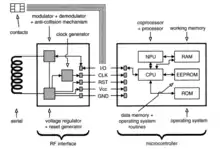 Les cartes à distance (RFID, NFC) possèdent une antenne et un convertisseur de signal associés à la puce. L'antenne perçoit le signal (alternatif) émis à distance par le terminal, et le convertisseur transforme ce signal d'une part en un courant continu qui alimente la puce, d'autre part en un courant alternatif appelé horloge qui sert à synchroniser les échanges de la puce et du terminal dans le temps.