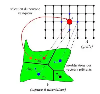 Le neurone vainqueur s et ses voisins (définis par une fonction d'appartenance au voisinage) déplacent leurs vecteurs référents vers le vecteur d'entrée