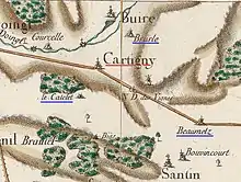 Sur la carte de Cassini ci-contre datant du XVIIIe siècle, Cartigny est situé sur le chemin de Pœuilly à Péronne.