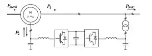 Comme l’amplitude et la pulsation des tensions rotoriques sont différents de ceux des tensions de ligne, le renvoi de puissance au réseau ne peut se faire qu’après conversion de tension et de fréquence[2].