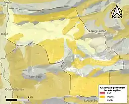 Le retrait-gonflement des sols argileux est susceptible d'engendrer des dommages importants aux bâtiments en cas d’alternance de périodes de sécheresse et de pluie[47]. 44,6 % de la superficie communale est en aléa moyen ou fort (59 % au niveau départemental et 48,5 % au niveau national)[Carte 7]. Depuis le , en application de la loi ELAN, différentes contraintes s'imposent aux vendeurs, maîtres d'ouvrages ou constructeurs de biens situés dans une zone classée en aléa moyen ou fort[Note 9],[48].