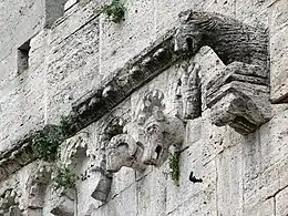 Chacune des parties latérales de la façade est percée d'une petite porte surmontée d'une galerie de trois baies séparées par des colonnettes à chapiteau, galerie elle-même surmontée de petites arcades ornées de têtes d'animaux comme les arcades de la partie centrale. La partie de droite présente également, au deuxième étage, une paire de petites baies géminées.
